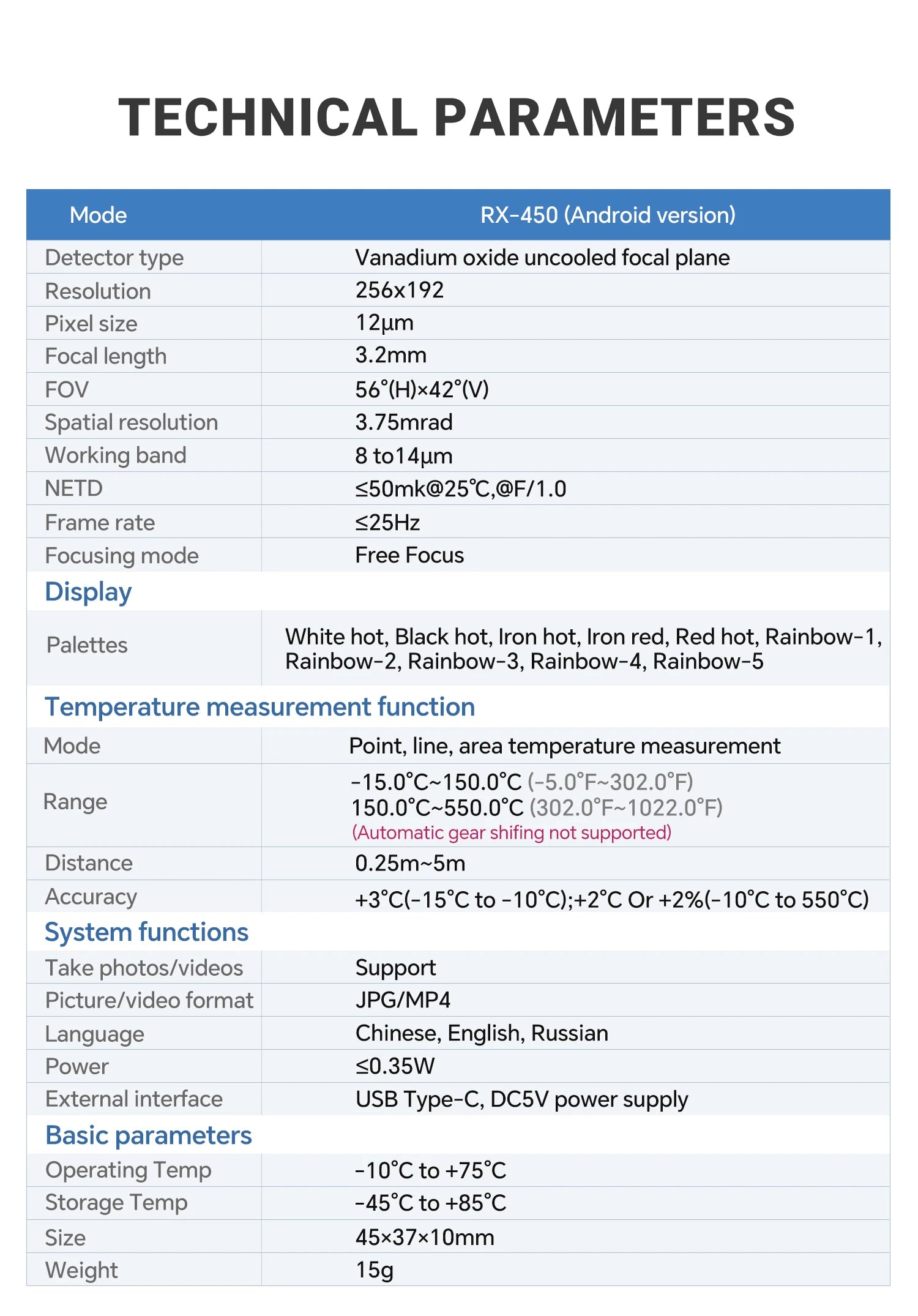 The A-BF RX-450 transforms your Android device into a powerful thermal imaging tool. Designed as a substitute for the InfiRay P2, this compact and lightweight thermal imager is perfect for night vision, temperature detection, and infrared analysis in a wide range of applications.